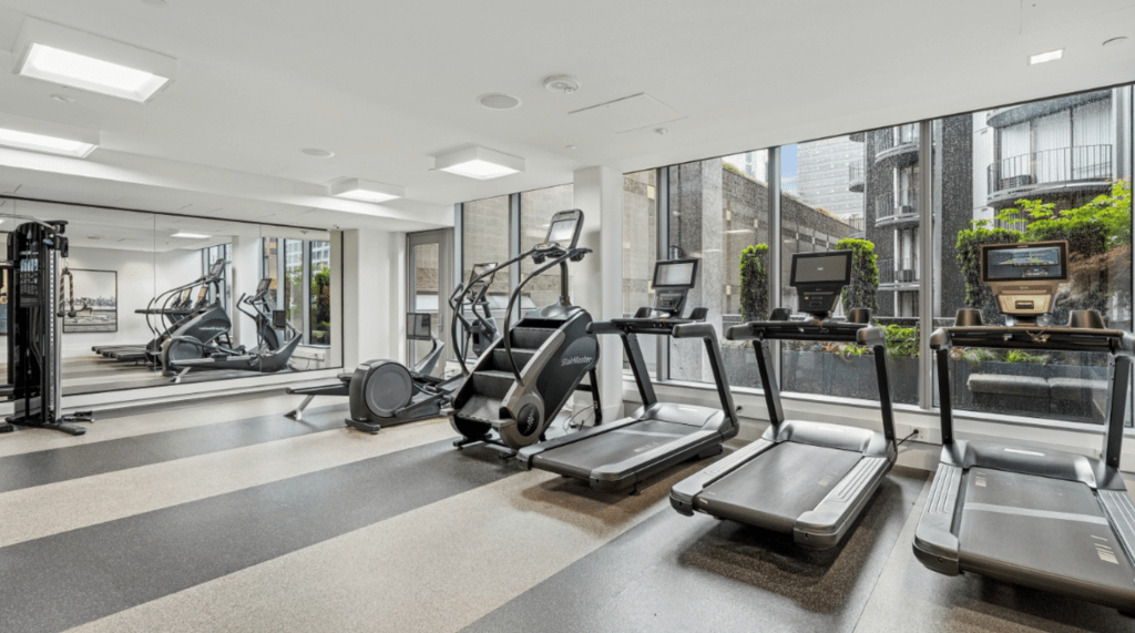 Large fitness center on sixth floor with squat rack, treadmills, free weights up to 90 pounds.