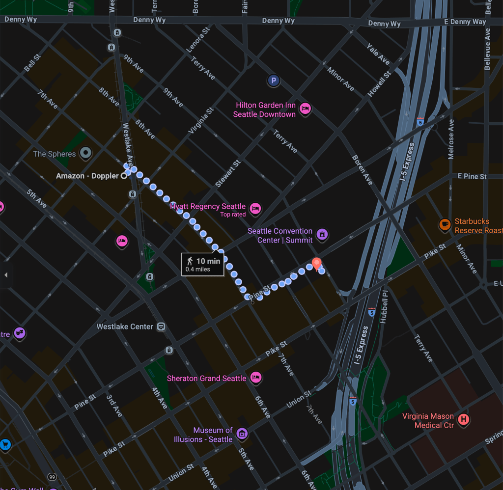 0.4 miles / 10 minute walk to the Amazon Spheres